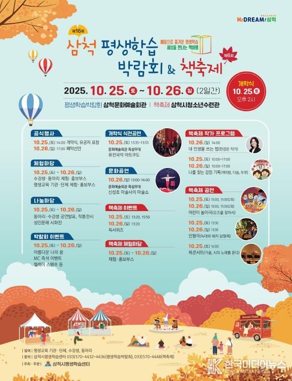 [ 한국미디어뉴스 이원영 기자 ] 삼척시는 오는 10월 25일부터 26일까지 이틀간 삼척문화예술회관과 삼척시청소년수련관 일원에서 ‘제16회 삼척평생학습박람회 및 제6회 책축제’를 개최한다.