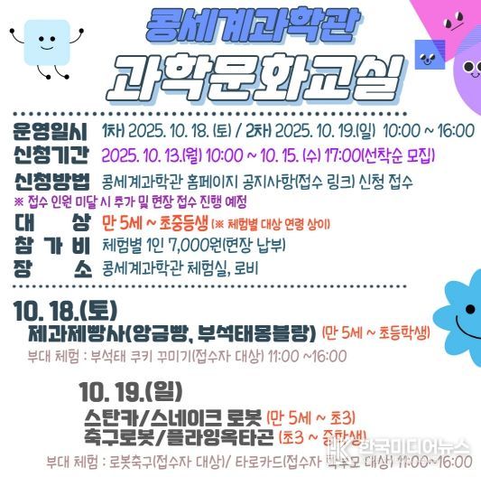 체험 대상은 만 5세부터 중학생까지이며, 프로그램별 난이도에 따라 참여 가능 연령이 다르므로, 자세한 내용은 과학관 누리집 공지사항에서 확인할 수 있다.