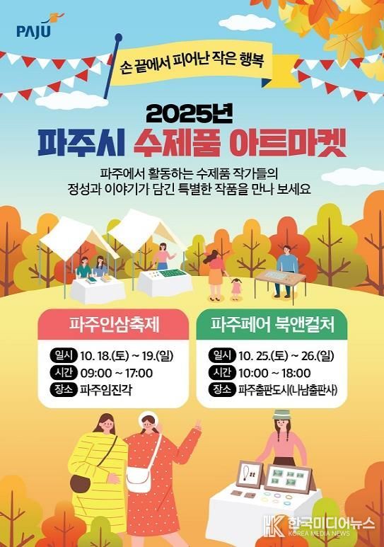 [ 한국미디어뉴스 이원희 기자 ] 파주시는 오는 18일부터 19일까지 이틀간 열리는 ‘파주인삼축제’와 오는 25일부터 26일까지 개최되는 ‘파주페어_북앤컬처’ 행사장에서 지역 수공예 작가들이 참여하는 ‘수제품 아트마켓’을 운영한다.