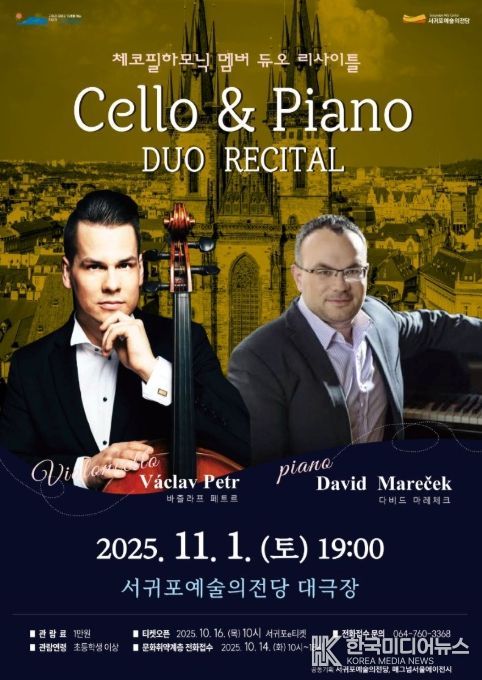 [ 한국미디어뉴스 이원영 기자 ] 서귀포시는 11월 1일 오후 7시, 서귀포예술의전당 대극장에서 체코필하모닉오케스트라 멤버 '첼로 & 피아노 듀오 리사이틀'을 개최한다고 밝혔다.