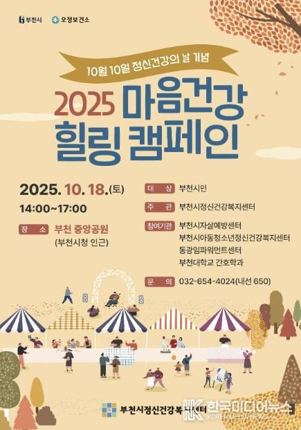 [ 한국미디어뉴스 김만길 기자 ] 부천시는 부천시정신건강복지센터와 함께 2025년 정신건강의 날(10월 10일)을 기념해 10월 18일 오후 2시부터 부천중앙공원에서 ‘2025 마음건강 힐링캠페인’을 연다.