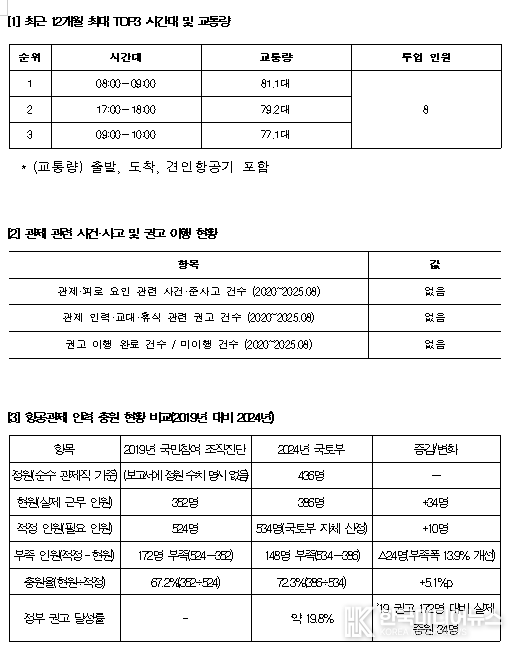 그럼에도 2024년 기준 순수 관제직 정원은 436명, 현원은 386명에 그쳐 국토부 자체 산정 적정인원 534명 대비 148명 부족(충원율 72.3%)으로 나타났다. 실제 충원도 34명(약 9.7%↑)에 불과해, 정부 권고 달성률은 약 19.8% 수준에 그쳤다.