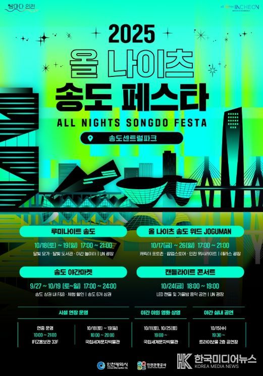 [ 한국미디어뉴스 이원영 기자 ] 인천광역시와 인천관광공사는 오는 10월 17일부터 26일까지 송도센트럴파크 일대에서 '2025 올 나이츠 송도 페스타'를 개최한다고 밝혔다.