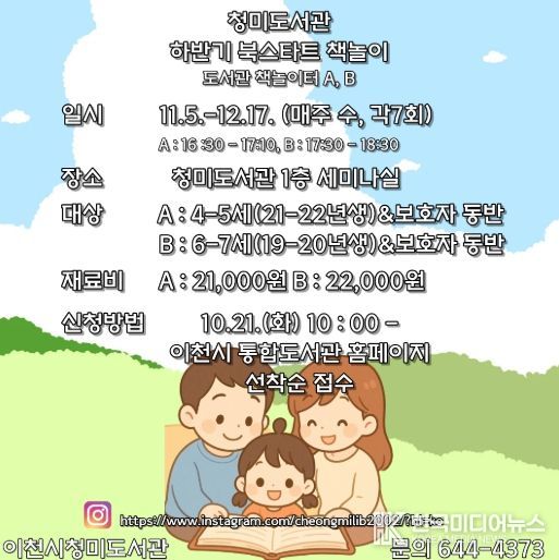[ 한국미디어뉴스 이보영 기자 ] 이천시 청미도서관은 오는 11월 5일부터 12월 17일까지, 유아와 보호자를 대상으로 ‘하반기 북스타트 책놀이’ 프로그램을 운영한다.