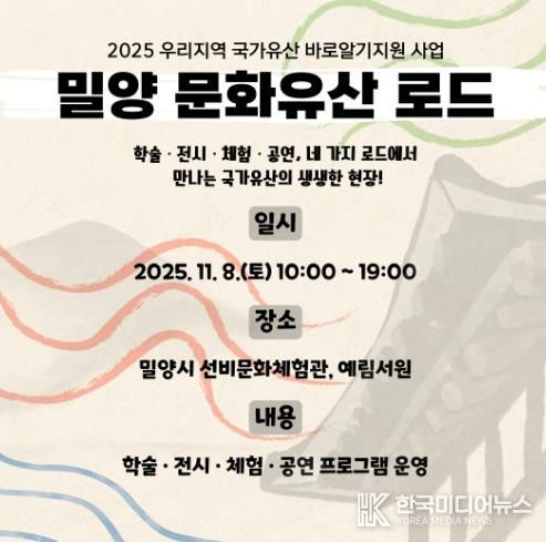 [ 한국미디어뉴스 이원영 기자 ] 밀양문화관광재단은 오는 11월 8일 오전 10시부터 오후 7시까지 예림서원과 선비문화체험관 일원에서 지역 무형유산의 가치를 시민과 함께 나누는 ‘밀양 문화유산 로드’를 개최한다고 13일 밝혔다.