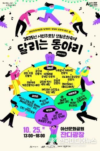 [ 한국미디어뉴스 김서안 기자 ] (재)아산문화재단은 오는 10월 25일 13시부터 18시까지 아산문화공원 잔디광장에서 시민이 주체가 되어 즐기는 ‘2025년 시민주도형 생활문화 축제 '달리는 동아리'’를 개최한다.