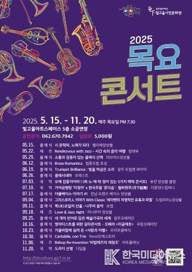 [ 한국미디어뉴스 이종철 기자 ] 광주문화재단(대표이사 노희용)은 오는 10월 16일, 23일, 30일 목요일 저녁 7시 30분, 빛고을아트스페이스 5층 소공연장에서 ‘10월의 목요콘서트’를 개최한다고 밝혔다.