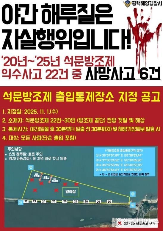 당진시는 계도기간 동안 전광판을 활용해 야간 출입 통제 홍보물을 송출할 계획이며, 11월 대조기 기간 평택해경과 합동 단속을 나설 예정이다.