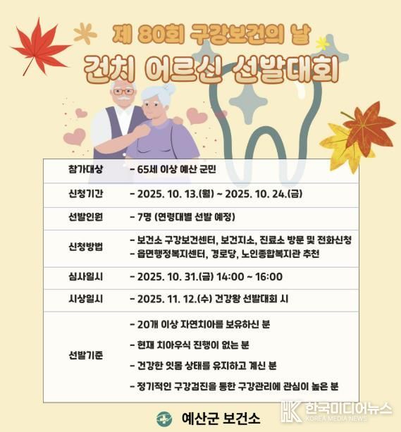 [ 한국미디어뉴스 김서안 기자 ] 예산군보건소는 ‘제80회 구강보건의 날’을 맞아 건강하고 활기찬 구강생활 실천 분위기 조성을 위해 건치(건강한 치아)어르신 선발대회를 개최한다.