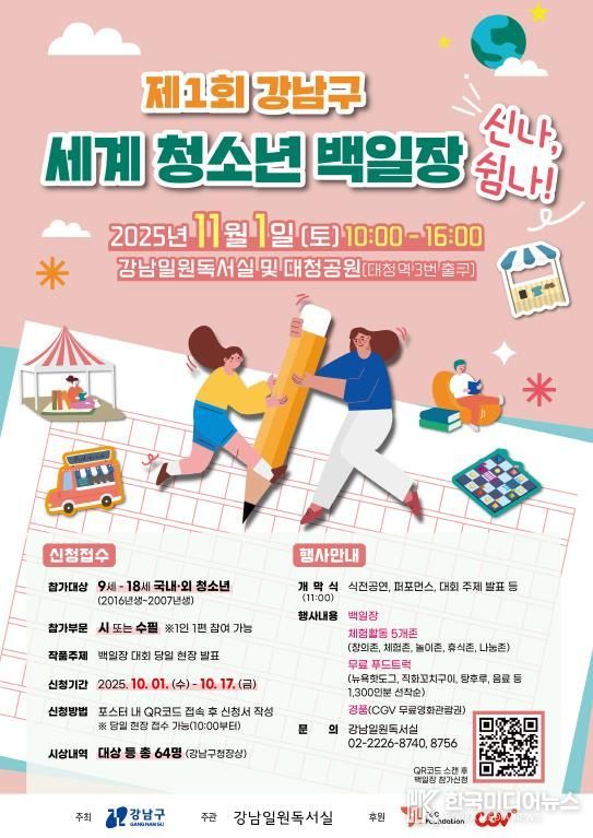 [ 한국미디어뉴스 이보영 기자 ] 꿈이 모이는 도시, 미래를 그리는 강남구가 오는 11월 1일 오전 10시부터 오후 4시까지 강남일원독서실과 대청공원 일대에서 ‘제1회 강남구 세계청소년백일장 신나, 쉼나!’를 개최한다. 이 행사는 국내‧외 국적 청소년이 함께하는 전국 최초의 기초지자체 주관 백일장으로, 다문화 시대와 K-컬처 확산 흐름에 발맞춘 문학축제다.