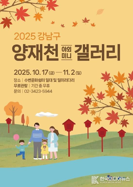 [ 한국미디어뉴스 이보영 기자 ] 꿈이 모이는 도시, 미래를 그리는 강남구가 오는 10월 17일부터 11월 2일까지, 양재천 수변문화쉼터~밀미리교 구간 산책로에서 ‘양재천 미니 아트 갤러리’를 운영한다.