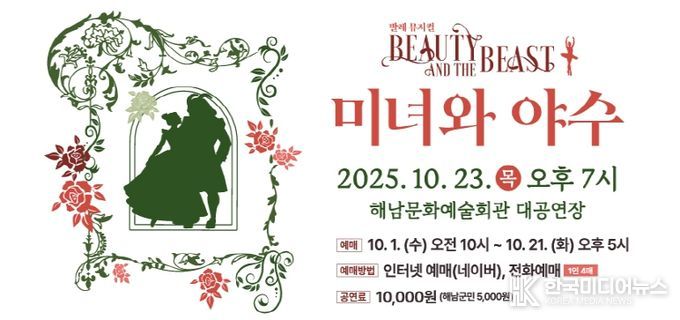 [ 한국미디어뉴스 이종철 기자 ] 해남군은 오는 10월 23일 오후 7시 해남문화예술회관 대공연장에서 발레뮤지컬 ‘미녀와 야수’공연을 선보인다.