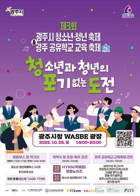 [ 한국미디어뉴스 이보영 기자 ] 광주시는 오는 25일 오후 2시부터 8시까지 시청 WASBE 광장에서 ‘제3회 광주시 청소년·청년 축제 청·포·도 · 광주 공유학교 교육 축제’를 개최한다고 14일 밝혔다.