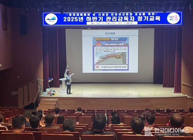 [ 한국미디어뉴스 김서안 기자 ] 예산군은 지난 13일 군청 추사홀에서 중대재해 예방과 안전한 근로환경 조성을 위해 ‘2025년 하반기 관리감독자 집체교육’을 실시했다고 밝혔다.