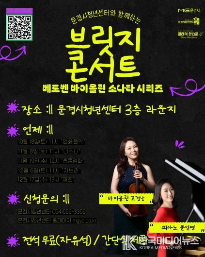 [ 한국미디어뉴스 이보영 기자 ] 문경시청년센터는 오는 10월부터 12월까지 문경시청년센터 3층 라운지에서 클래식을 주제로 한‘브릿지 콘서트’를 연다.