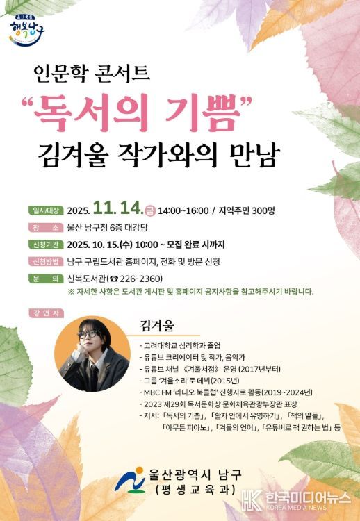 이번 ‘인문학 콘서트’는 11월 14일 오후 2시 남구청 6층 대강당에서 개최되며 유튜브 채널(구독자 29만 명) ‘겨울서점’ 운영자이자 작가로 활발히 활동 중인 김겨울 작가를 초청해 ‘독서와 글쓰기를 통해 더 나은 자신으로 나아가는 길에 대해 이야기를 나누는 시간’이라는 주제로 진행될 예정이다.