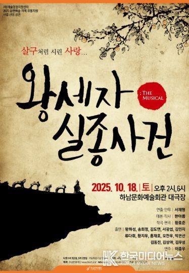[ 한국미디어뉴스 김서안 기자 ] (재)하남문화재단은 오는 10월 18일 오후 2시와 6시, 하남문화예술회관 대극장에서 창작 뮤지컬 '왕세자 실종사건'을 선보인다. 이번 작품은 조선 궁궐을 배경으로 벌어지는 왕세자의 갑작스러운 실종사건을 중심으로 인간의 욕망과 권력, 순수한 사랑이 교차하는 궁정 미스터리 멜로물이다. 미스터리한 사건 전개, 감성적인 서사, 다채로운 음악이 어우러져 관객들에게 눈과 귀, 머리로 즐기는 ‘3배의 재미’를 선사할 예정이다.