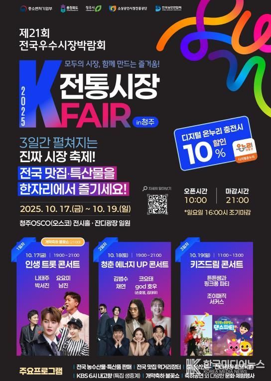 [ 한국미디어뉴스 김풍옥 기자 ] 청주시는 ‘2025 전국 우수시장 박람회(K-전통시장 페어 in 청주)’가 오는 17일부터 19일까지 3일간 청주오스코에서 개최된다고 밝혔다.