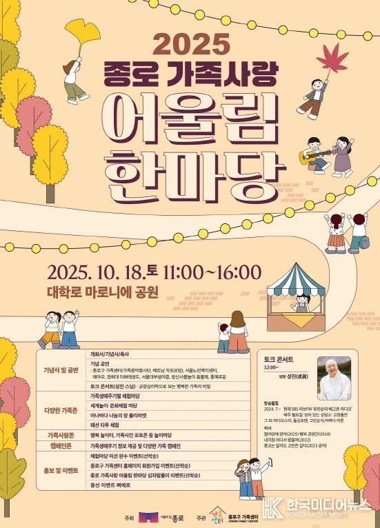 [ 한국미디어뉴스 이보영 기자 ] 종로구는 10월 18일 11시부터 16시까지 대학로 마로니에공원에서 '2025 종로 가족사랑 어울림한마당'을 개최한다.