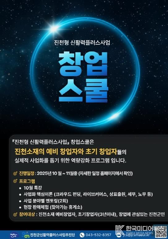 [ 한국미디어뉴스 김풍옥 기자 ] 충북 진천군 신활력플러스사업 추진단은 오는 11월까지 약 2개월간 지역 창업 역량을 높이고, 창업 꿈을 현실로 만드는 ‘진천형 신활력플러스사업 창업스쿨’을 본격 운영한다고 15일 밝혔다.
