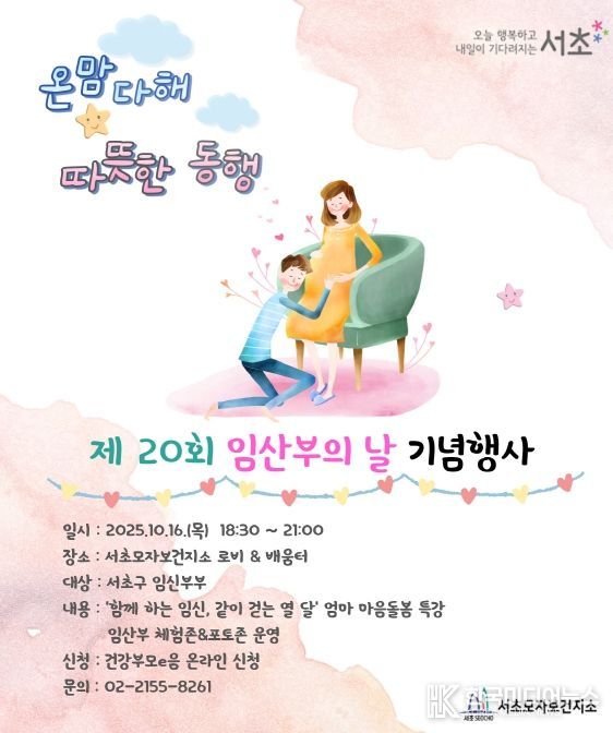 [ 한국미디어뉴스 이보영 기자 ] 서울 서초구는 제20회 임산부의 날(10.10.)을 맞아 16일 오후 6시 30분부터 9시까지 서초보건지소에서 ‘온맘다해, 따뜻한 동행’을 주제로 기념행사를 개최한다고 밝혔다.