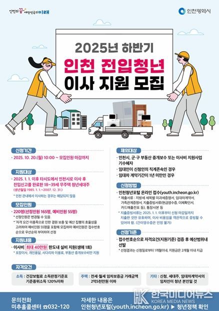 [ 한국미디어뉴스 이원영 기자 ] 인천광역시는 인천으로 전입하는 청년들의 주거비 부담을 완화하고 지역사회에 안정적으로 정착할 수 있도록, 상반기에 이어 하반기에도 최대 40만 원의 이사비를 지원한다고 밝혔다.