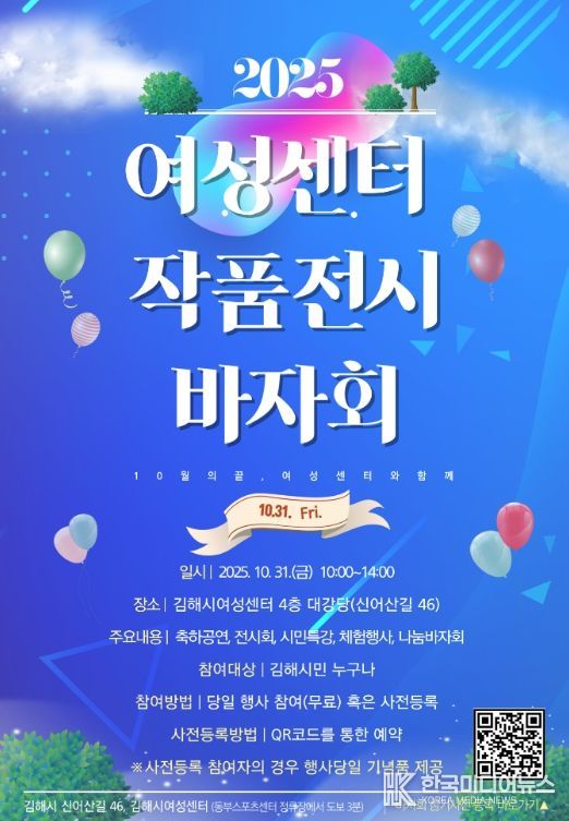 [ 한국미디어뉴스 이원영 기자 ] (재)김해시복지재단 김해시여성센터는 오는 31일 김해시여성센터 4층 대강당 및 다목적실에서 '여성센터 수강생 작품전시·바자회'와 'AI시대 시민 인문학 특강'을 연계한 시민참여형 복합행사를 추진한다고 밝혔다.