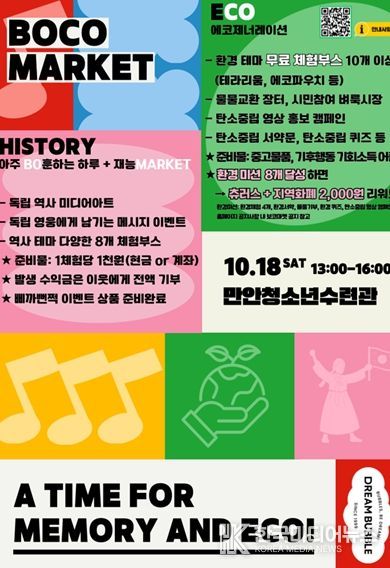 [ 한국미디어뉴스 이보영 기자 ] 안양시청소년재단 소속 만안청소년수련관은 오는 10월 18일 청소년과 시민이 함께하는 ‘환경과 역사를 잇다 - BOCO MARKET & E-G 페스티벌’을 개최한다고 15일 밝혔다.