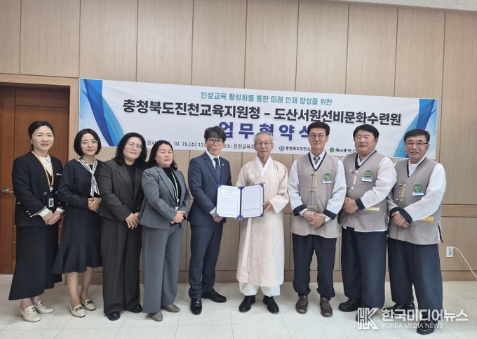 [ 한국미디어뉴스 김풍옥 기자 ] 충청북도진천교육지원청은 10월 15일도산서원선비문화수련원(이사장 김병일)과 진천 교육공동체의 인성교육 활성화를 위한 업무협약을 체결했다.