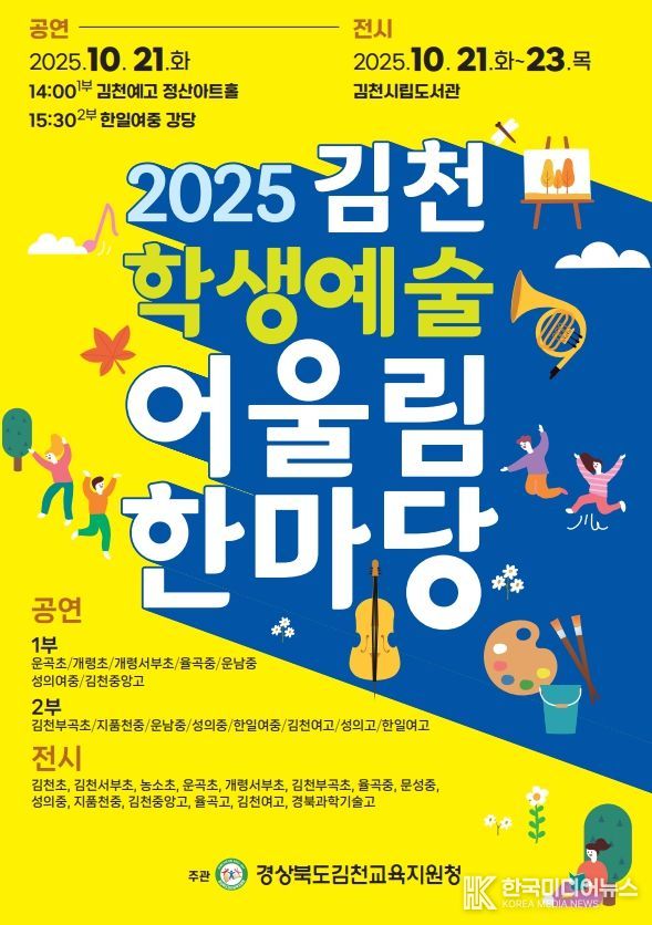 [ 한국미디어뉴스 이보영 기자 ] 경상북도김천교육지원청은 오는 10월 21일 김천예술고등학교와 한일여자중학교에서 공연 행사를 열고, 김천시립도서관에서 전시 행사(21일-23일)를 통해 ‘2025 김천학생예술어울림한마당’을 개최한다.