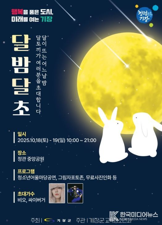 [ 한국미디어뉴스 이원영 기자 ] 기장군은 오는 18일부터 19일까지 정관읍 중앙공원 일원에서 2025 기장군청소년어울마당 ‘달밤달초’를 개최한다고 15일 밝혔다.