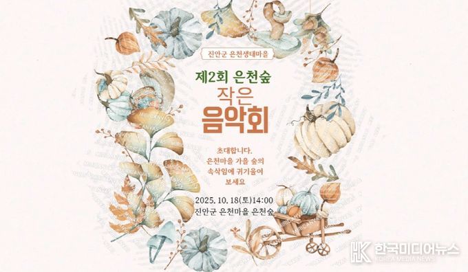 [ 한국미디어뉴스 이종철 기자 ] 진안군은 오는 18일 오후 2시~4시까지 은천생태마을 숲에서 ‘두 번째 은천숲 작은 음악회’가 열린다고 밝혔다.