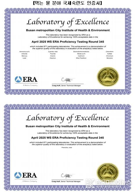 [ 한국미디어뉴스 이원영 기자 ] 부산시 보건환경연구원은 먹는 물 분야 분석 능력 검증을 위해 참가한 미국 환경자원협회(ERA) 주관 국제숙련도 평가에서 전 항목 '만족' 판정을 받아 '최고 등급' 인증을 획득했다고 밝혔다.
