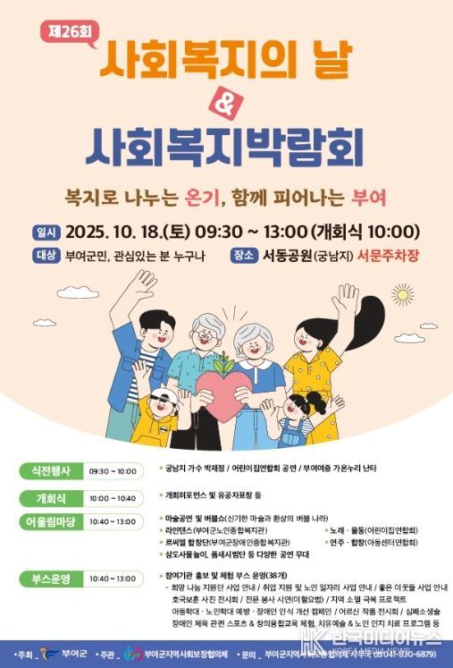 [ 한국미디어뉴스 김서안 기자 ] 부여군은 오는 10월 18일 서동공원 서문주차장에서 ‘제26회 사회복지의 날 및 사회복지박람회’를 개최한다고 밝혔다.
