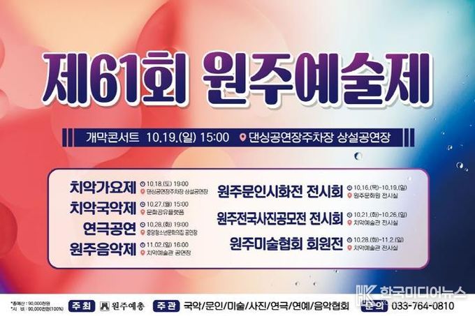 [ 한국미디어뉴스 이원영 기자 ] (사)원주예총은 오는 10월 16일부터 11월 2일까지 원주시 댄싱공연장 주차장 상설공연장과 치악예술관 전시실 등 원주 전역에서 시민과 함께하는 ‘제61회 원주예술제’를 개최한다.