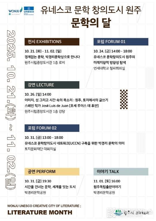[ 한국미디어뉴스 이원영 기자 ] ‘유네스코 문학 창의도시 원주’가 오는 10월 21일부터 11월 2일까지 ‘시간을 건너는 문학, 세계를 잇는 도시’를 기치로'2025년 원주 문학의 달'행사를 개최한다.