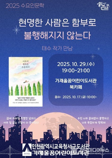 [ 한국미디어뉴스 이원영 기자 ] 인천광역시교육청서구도서관은 10월 29일 오후 7시부터 9시까지 『어른의 행복은 조용하다』의 저자 태수 작가를 초청해 ‘수요인문학’ 강연 ‘현명한 사람은 함부로 불행해지지 않는다’를 진행한다.