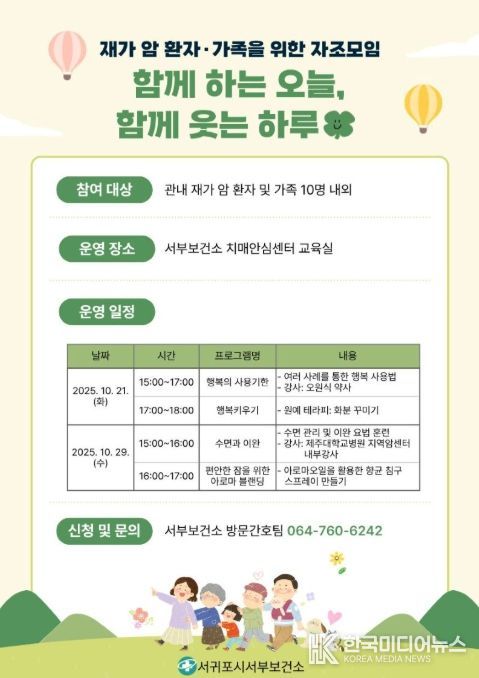 [ 한국미디어뉴스 이원영 기자 ] 서귀포시 서부보건소에서 10월 21일과 29일 오후 3시부터 6시까지 재가 암 환자 및 가족들을 위한 자조 모임을 운영한다.