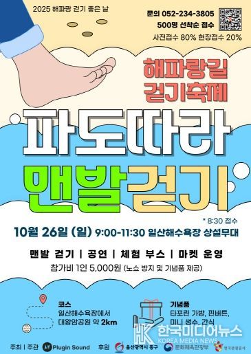 [ 한국미디어뉴스 이보영 기자 ] 울산 동구가 오는 10월 26일 오전 9시부터 11시 30분까지 일산해수욕장 상설무대 일원에서 ‘2025 해파랑길 걷기 축제 – 파도 따라 맨발 걷기’를 개최한다.