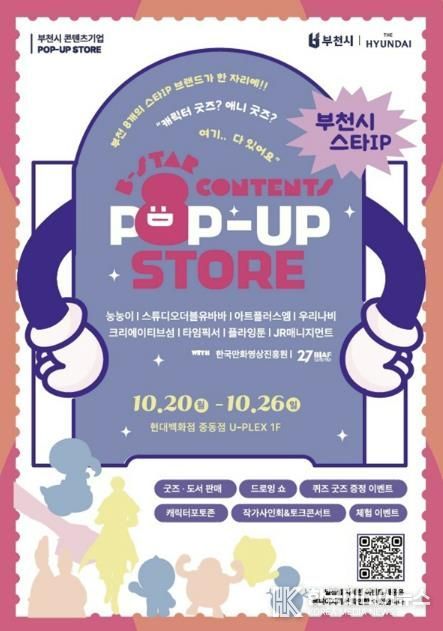 [ 한국미디어뉴스 김만길 기자 ] 부천시는 10월 20일부터 26일까지 현대백화점 중동점 U-PLEX 1층에서 지역 우수 콘텐츠 기업 8개 사가 참여하는 팝업스토어 ‘8 CONTENTS, ONE STAGE in BUCHEON’을 운영한다.