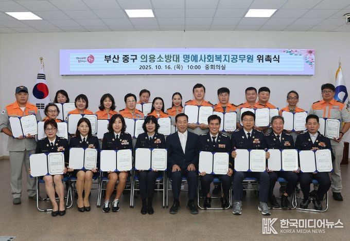 [ 한국미디어뉴스 이원영 기자 ] 부산 중구는 지난 16일 중부소방서 의용소방대원 54명을 중구 명예사회복지공무원으로 위촉하는 행사를 개최했고, 중부소방서 의용소방대 본대 이봉석 남성대장, 심경란 여성대장등이 참석했다.