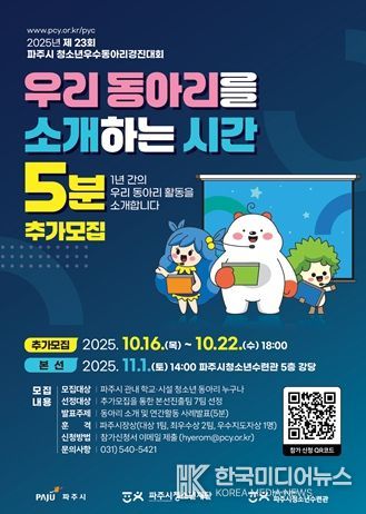 [ 한국미디어뉴스 이원희 기자 ] (재)파주시청소년재단 파주시청소년수련관은 오는 10월 16일부터 10월 22일까지 “제23회 파주시 청소년우수동아리경진대회”의 참가 동아리를 모집한다.