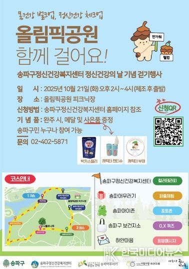 [ 한국미디어뉴스 이보영 기자 ] 완연한 가을을 맞아, 서울 송파구가 오는 21일 오후 2시 올림픽공원 일대에서 정신건강의 날 기념 걷기 행사 ‘몸건강 벌크업, 정신건강 체크업’을 개최한다고 알렸다.
