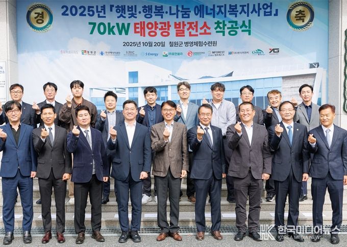 [ 한국미디어뉴스 이원영 기자 ] 10월 20일 오전 11시, 철원군 갈말읍에 위치한 철원군병영체험수련원에서 '햇빛·행복·나눔 에너지복지사업 70kW 태양광 발전소 착공식'이 열렸다. 이 행사에는 강원특별자치도 산업국장, 철원군수, 한국에너지공단 강원지역본부장, 한국기후변화연구원장, 그리고 강동에너지대표이사 등 5개 신재생에너지 관련 민간기업 대표가 참석했다.