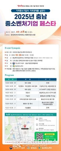 [ 한국미디어뉴스 김서안 기자 ] (재)충남테크노파크(원장 서규석)는 도내 중소벤처기업의 혁신 성장과 상생 네트워크 강화를 위해 '2025 충남 중소벤처기업 페스타'를 28일 충남북부상공회의소 10층 대회의실에서 개최한다고 밝혔다.