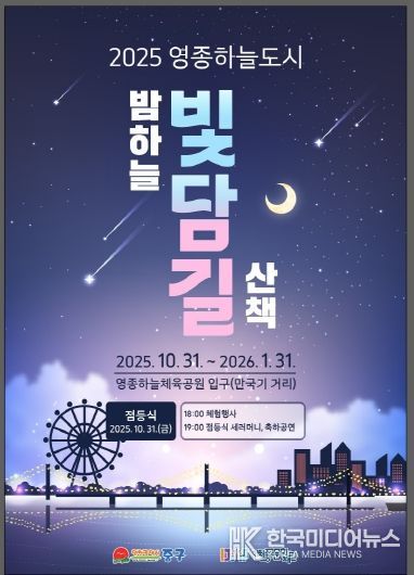 [ 한국미디어뉴스 최치남 기자 ] (재)인천중구문화재단(이사장 김정헌)은 올해 10월 31일부터 오는 2026년 1월 31일까지 3개월간 야간 경관조명 ‘2025 영종 빛 축제 - 영종하늘도시 밤하늘 빛담길’을 운영한다고 밝혔다.