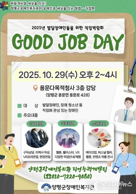 [ 한국미디어뉴스 김서안 기자 ] 대한불교조계종사회복지재단이 운영하는 양평군장애인복지관은 오는 29일 오후 2시부터 4시까지 용문다목적청사 3층 강당에서 발달장애인의 직업 탐색 기회를 지원하기 위한 직업박람회 ‘GOOD JOB DAY’를 개최한다.