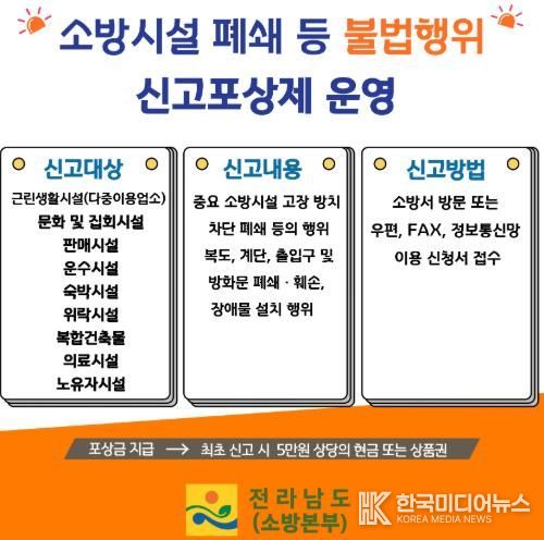 [ 한국미디어뉴스 이원영 기자 ] 나주소방서는 소방시설에 대한 불법행위를 근절하고 자율적인 안전문화를 정착시키기 위해 연중 ‘불법행위 신고포상제’를 운영하고 있다고 21일 밝혔다.