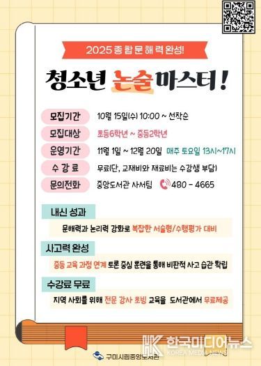 이선임 시립중앙도서관장은 “이번 논술마스터 과정을 통해 청소년들이 영상 중심의 문화에서 벗어나 다양한 사회 주제를 깊이 탐구하고, 자신만의 관점을 논리적으로 표현하는 진정한 배움의 즐거움을 느끼길 바란다”고 했다.