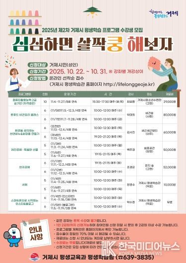 [ 한국미디어뉴스 이원영 기자 ] 거제시는 오는 10월 22일부터 31일까지 ‘심쿵해(심심하면 살짝쿵 해보자)’ 평생학습 프로그램 수강생을 선착순으로 모집한다고 밝혔다.